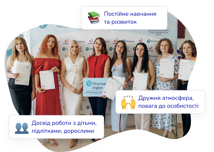 Наша команда — це 15 кваліфікованих викладачів з досвідом, сертифікатами (TEFL, TESOL, Pearson, Goethe-Institut) та щирим бажанням навчати.